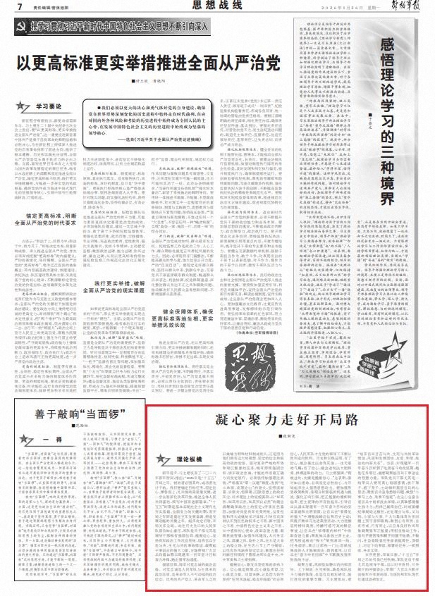 新年前夕,习主席发表了二〇二六年新年贺词,指出:“2026年是‘十五五’开局之年。锐始者必图其终,成功者先计于始。我们要锚定目标任务,坚定信心、乘势而上,扎实推动高质量发展,进一步全面深化改革开放,推进全体人民共同富裕,续写中国奇迹新篇章。”“十五五”时期是基本实现社会主义现代化夯实基础、全面发力的关键时期,而开局之年则是奠定五年发展基调、塑造发展动能的关键之年。起步决定后势,开局关系全局。站在历史关口的人民军队肩负如山重任,军队党员干部尤其是领导干部唯有强固信仰、提振信心,发扬我军政治工作优良传统,培养官兵甘苦与共、生死与共的革命情谊,凝聚起干事创业的强大力量,方能带领广大官兵向着如期实现建军一百年奋斗目标奋力冲锋,跑出强军加速度。