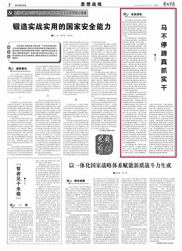 马不停蹄真抓实干,首要根植于绝对忠诚的政治品格。马不停蹄的疾驰之姿,象征着一种永不懈怠、一往无前的奋斗状态。马不停蹄是外化表现,绝对忠诚是内在根基。没有对党绝对忠诚作为精神内核和动力源泉,干劲就难以持久、难以汇聚;没有坚守战位的勇毅承担,绝对忠诚就易沦为徒有其表的空泛表态。唯有将绝对忠诚融入血脉、铸入灵魂、嵌入使命,才能真正激发出永不枯竭的奋斗力量,从而在强军兴军的时代号角感召下策马扬鞭,向着伟大目标奋勇进发。理论是行动的先导,党的创新理论涵养着共产党人、革命军人绝对忠诚的政治品格。广大官兵要持续深化党的创新理论武装,坚持不懈用习近平新时代中国特色社会主义思想凝心铸魂,突出学好习近平强军思想,深刻领悟“两个确立”的决定性意义,坚决做到“两个维护”,贯彻军委主席负责制,将忠诚之魂、强军之志,转化为马不停蹄真抓实干的扎实行动,以“朝受命、夕饮冰”的紧迫感,“昼无为、夜难寐”的责任感,奋力跑好历史的接力棒,全力打好实现建军一百年奋斗目标攻坚战。