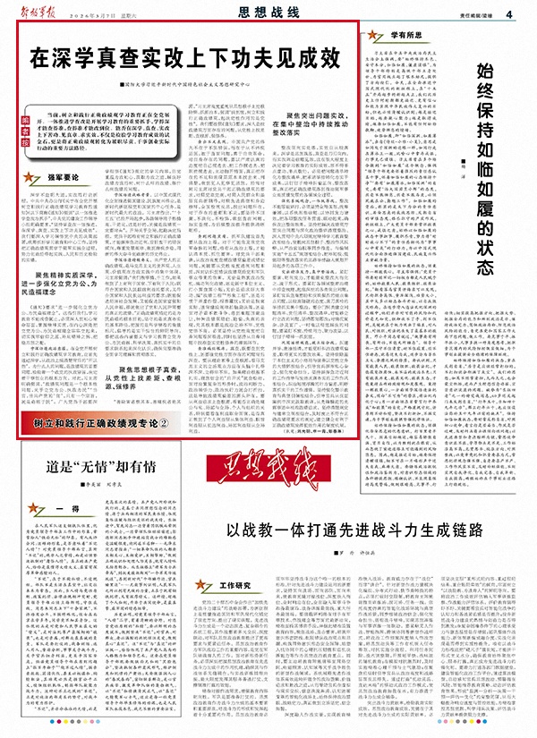 整改须向实处落,实效自从较真来。深学是思想筑基,真查是刀刃向内,而实改则是破题见效,这在很大程度上决定着学习教育的实际成效,容不得半点虚功、半点敷衍。必须把问题清单转化为整改清单、把承诺举措转化为实干成果,以钉钉子精神纠偏正向、整改落实,真正把正确政绩观落到推动强军事业高质量发展的各领域全过程。