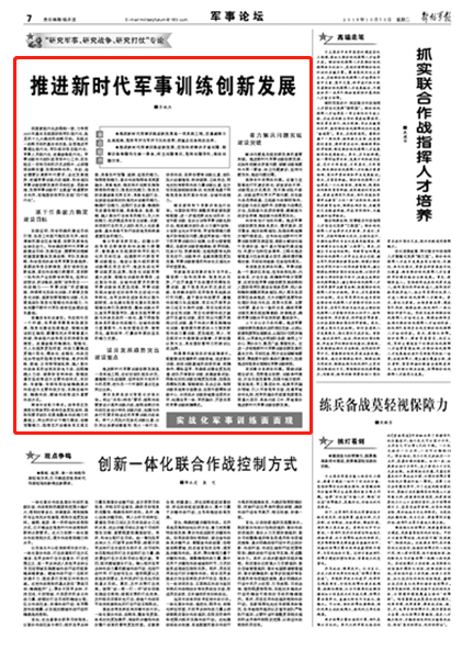 当前,迫切需要认清新时代要求,适应发展趋势,把握军事训练内在规律,科学规划军事训练创新发展的目标任务、思路举措,发挥军事训练的“主渠道”和重要抓手作用,助推国防和军队实现“四个现代化”。请关注今日《解放军报》的报道——
