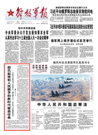 国家主席习近平3月20日在十三届全国人大一次会议上的重要讲话,吹响了新时代进军的号角。军队因使命而存在,军人因履行使命而荣光。请关注今日出版的《解放军报》的评论员文章——