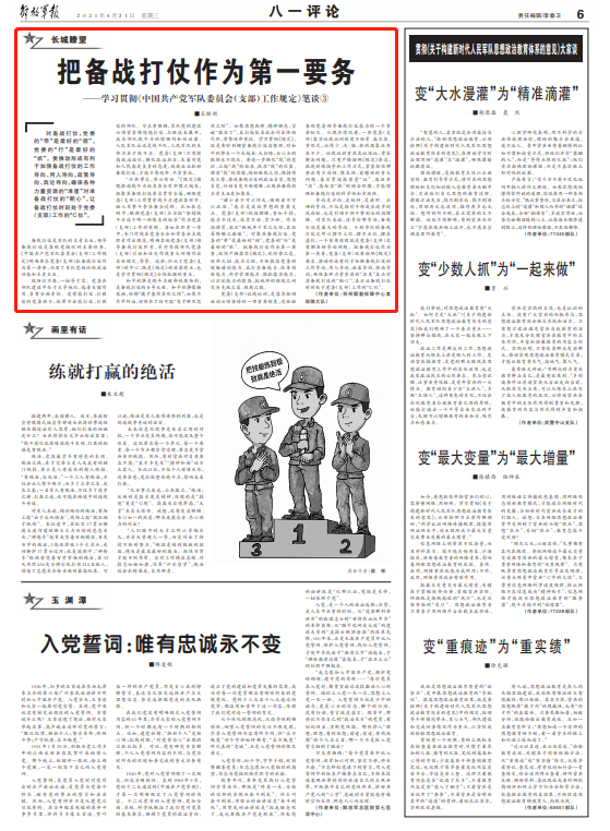 “褚小者不可以怀大,绠短者不可以汲深。”能力是成就梦想的重要支点。党委(支部)的指挥棒,重如千钧,能力不过关,就拿不动、拿不好。作为指挥员,就应“胜统率千军之大任,具运筹帷幄之谋略”。对聚焦备战打仗,党委的“带”是最好的“领”,党委的“行”是最好的“抓”。把备战打仗作为第一要务,就须严格落实《规定》,忧形势之危、使命之切、能力之短,不断提高党委的战略谋划能力、真打实备能力、改革创新能力、科学管理能力、狠抓落实能力,以打仗能力的提高,把统帅的胜战之问变为克敌之策、胜战之能。
