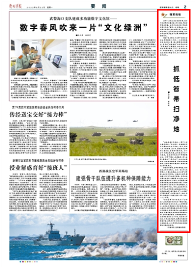 根据杠杆原理,笤帚抓得越高,作用在地上的力就越小。如此一来,劲儿使得越大,力量也就越偏,从而出现“笤帚断,地还乱”的情况。为基层办实事、解难题,用对力气也格外重要。各单位既不能无视实际一厢情愿、好大喜功,也不能想问题简单化、片面化,而是要聚力解决制约建设发展的重难点问题、工作的短板弱项以及官兵关心的急难愁盼,这样才会事半功倍。同时,各级领导和机关干部也应牢固树立精准高效的理念,坚持精准施策、稳步推进,变“大水漫灌”为“精准滴灌”;力戒眉毛胡子一把抓,坚持一把钥匙开一把锁,做到一事一办法、一人一对策。