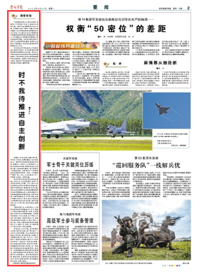 “全面建设社会主义现代化强国,实现第二个百年奋斗目标,必须走自主创新之路。要时不我待推进科技自立自强,只争朝夕突破‘卡脖子’问题,努力把关键核心技术和装备制造业掌握在我们自己手里。”习主席近日在辽宁考察时再次强调实施创新驱动发展战略的重大意义,并对推进自主创新提出明确要求,作出具体要求部署。全军官兵要认真学习贯彻习主席重要讲话精神,坚持自主创新这个战略基点,把我军发展命脉牢牢掌握在自己手中。
