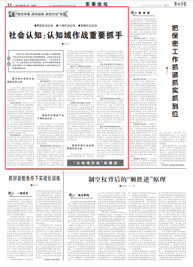 紧盯法理争夺。战争历来强调师出有名。在认知叙事中掌握战争的定义权、解释权,形成一致的社会主流意见,凝聚起国家或民族的价值认同,调动广泛的力量和资源,是先期认知域作战的一个重要目标。搞好正义叙事表述,营造师出有名、正义在我、法理在手的社会认知,是先于战争出鞘的“利剑”,早于战争发起的“重器”。为此,认知域作战需要主动创设议题,设法为战争定性、为行动正名,做好“正当防卫”的叙事、“被迫合法”的界定、“最后手段”的阐释,使捍卫战争正义权成为社会主流意见。