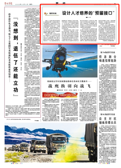 如何提升军事人才的预先培养效益?需要我们从人才成长的源头抓好设计。国产大型运输机运-20在设计制造之初,就根据空投、机降、空降、运输等不同任务,预留接口,配备装备,确保命令一下达,就能够随时执行支援保障任务。“预留接口”的设计思路,对军队院校人才培养同样具有启发意义。可以说,设计人才培养的“预留接口”,加快新型作战力量人才培养,既是推动部队转型发展、打赢未来战争的重要举措,也是驱动先进战斗力供给的有效手段。