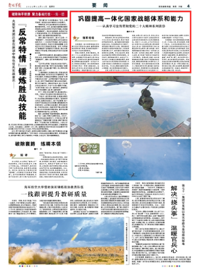 强国必须强军,军强才能国安。党的二十大从全面建设社会主义现代化国家、全面推进中华民族伟大复兴的全局出发,对国防和军队建设作出战略部署,强调要如期实现建军一百年奋斗目标,明确把巩固提高一体化国家战略体系和能力作为一项重大战略任务。这要求全军官兵从政治和战略全局高度深刻理解这一战略部署的重大意义,扎实抓好各项举措的有效落实。