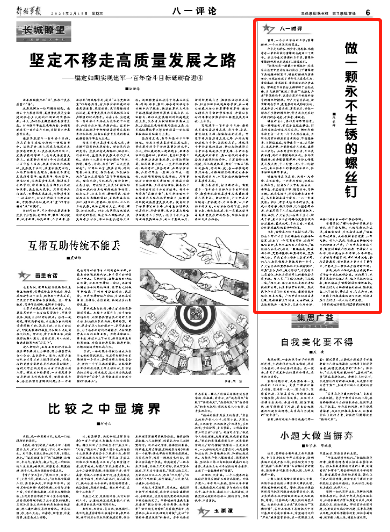 雷锋常说:“螺丝钉要经常保养和清洗,才不会生锈。人的思想也是这样,要经常检查,才不会出毛病。”螺丝钉不被淘汰,就要保持自身锃亮、永不生锈。对军人来说,思想上的锈蚀比枪炮的锈蚀更严重。广大官兵身为战斗员,理应树牢战斗队思想、坚持战斗力标准,决不能有和平思维、和平积弊。只有保持思想常新,强化战争观念,坚持革弊鼎新,始终聚焦主责主业干事创业,才能成为一颗永不生锈的螺丝钉。