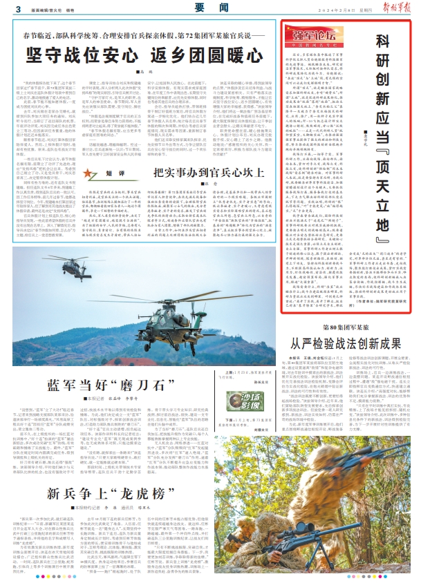 战场打不赢,一切等于零。军事科研工作,应面向战场、面向部队、面向未来,紧盯对手之变、战场之变、科技之变,使科研创新“供给侧”同未来战场“需求侧”精准对接。对军事科研人来说,就是要坚持为军而研、为战而研,既要瞄准世界军事科技前沿、加强前瞻谋划设计这个关键点,又要抓住服务战场打赢、服务备战打仗的基本点,下大力气解决好科研同部队需求脱节等问题。实践证明,科研的“根”扎得越深,“叶”才能更茂;“地”踩得越实,“天”才会更高。