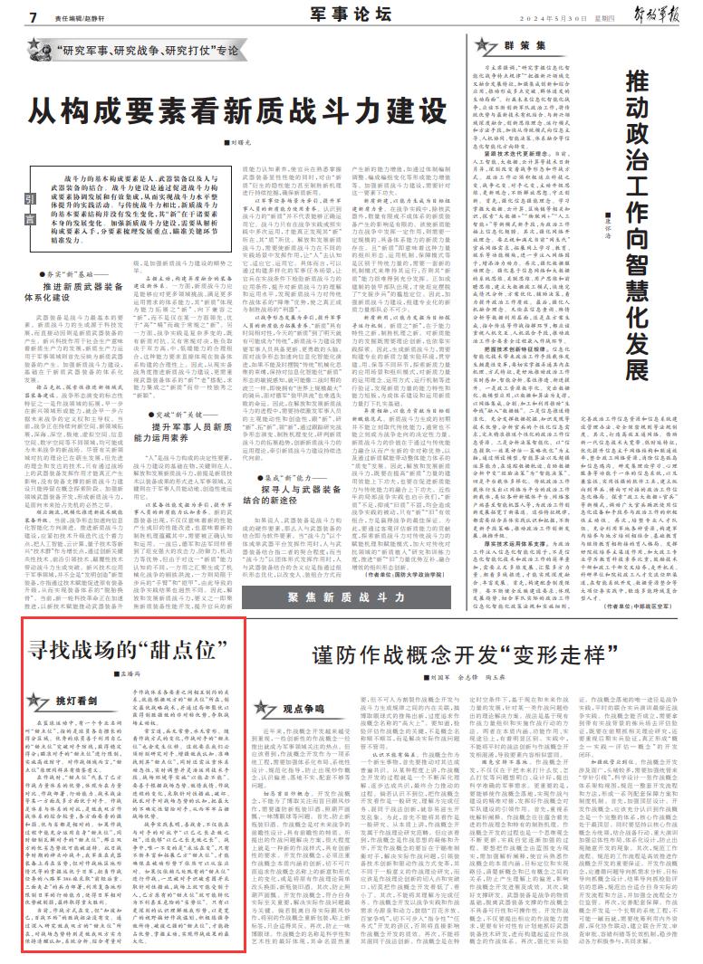 在篮球运动中,有一个专业名词叫“甜点位”,指的是球员各自擅长的得分区域。优秀的球员善于利用自己的“甜点位”突破对手防线,获得稳定得分;瞄准对手的“甜点位”进行限制,实施高效防守。对作战领域而言,“甜点位”原理同样具有借鉴意义。