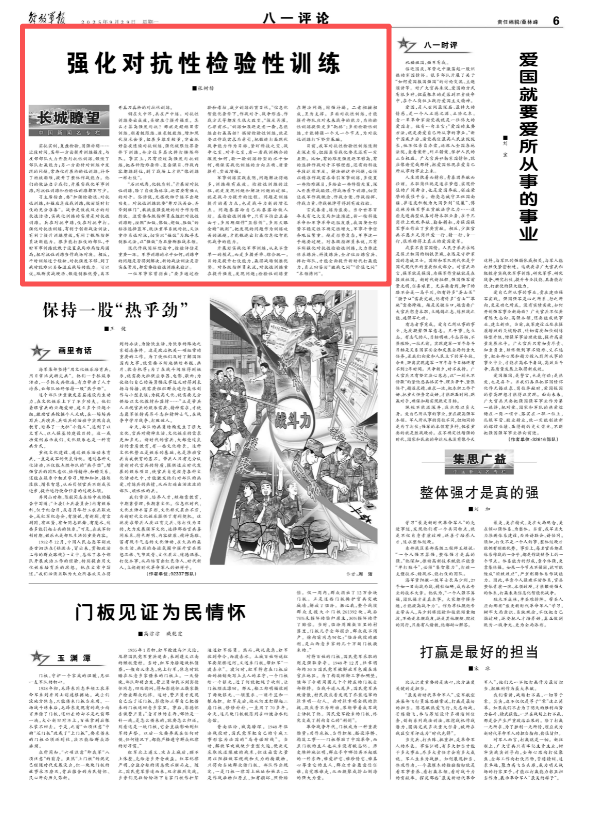 实抗实训,复盘检验,固强补弱……近段时间,某部一方面提升训练强度,与友邻部队大力开展对抗性训练,锻造了部队打赢能力;另一方面针对训练中发现的问题,常态化开展检验性训练,补齐了短板弱项,提升了整体作战能力。他们的做法启示我们,开展实战化军事训练,对抗性训练和检验性训练都不可少。