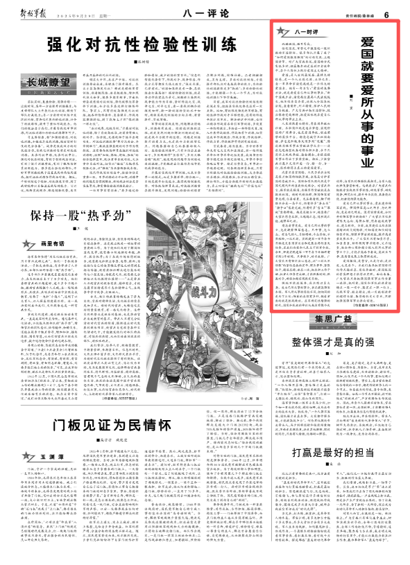爱国报国,是誓言,也是行动;是热爱,也是奋斗。当我们真正把家国情怀化作无悔追求、岗位奉献时,爱国报国的崇高理想才能得以实现。面向未来,广大官兵只要把强国强军事业作为第一选择,把对党、国家和军队的热爱熔铸在一岗一哨中、落实在一职一位上,扎根军营、敬业精业,就一定能创造新的辉煌业绩、赢得新的更大荣光,不断把强国强军事业推向前进。
