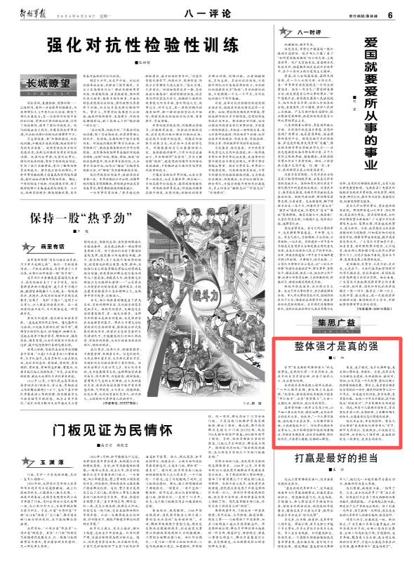 独木不成林,单兵难排阵。带兵人应向那些“最美新时代革命军人”学习,树牢大局意识、系统观念,不仅把自己搞过硬,还要把人才培养好,真正做到既为一域争光、更为全局添彩。