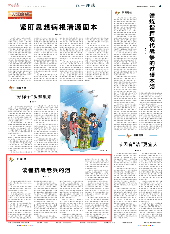 时光年轮,记录变化;时代际遇,塑造人生。最是家国动人心,最是情怀能致远。抗战老兵的泪光,照射出信仰、志向、荣耀,还有未来。读懂抗战老兵的泪,就会沿着这道光,将爱国之情转化为报国之志、强军之行,始终和祖国同前行、与时代齐发展、与军队共进步。