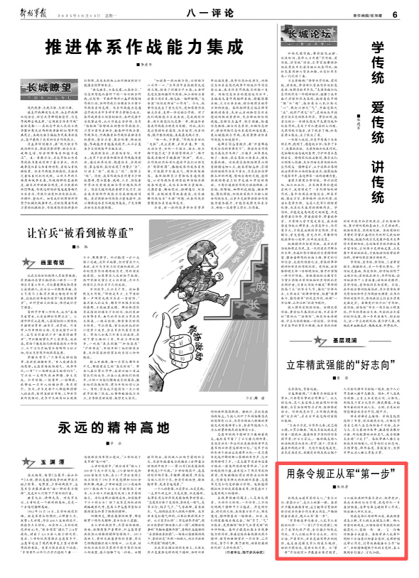 新战友迈进军营的大门,“有令必行、有禁必止”,是必上的第一课。各单位开展新兵教育时,应当把学习贯彻新修订的共同条令作为重点内容,严格按照条令要求,规正从军“第一步”。