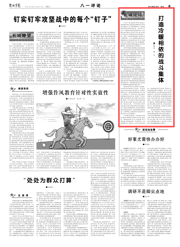 叶剑英同志曾说:“平时能把兵带好、练好,战时用兵才能运用自如,打胜仗。”未来的战争,是人才的竞争、智力的比拼、科技的较量。作为带兵人,承担着教育人、塑造人、引导人的重要责任。要想战时官兵少流血、打胜仗,平时就需要育好兵、砺精兵。除了关心官兵的合理需求,还应想方设法助力他们成长成才。“刘老庄连”始终坚持用信任的眼光、欣赏的眼光、发展的眼光看待官兵,形成互帮互学、互信互爱的良好局面。这也启示我们,带兵人只有真知兵、深知兵,了解官兵秉性特长、成长渴求,因材施教、因需引导,才能真正带出战斗力、管出好作风,让官兵在充满阳光的环境下加速成长。
