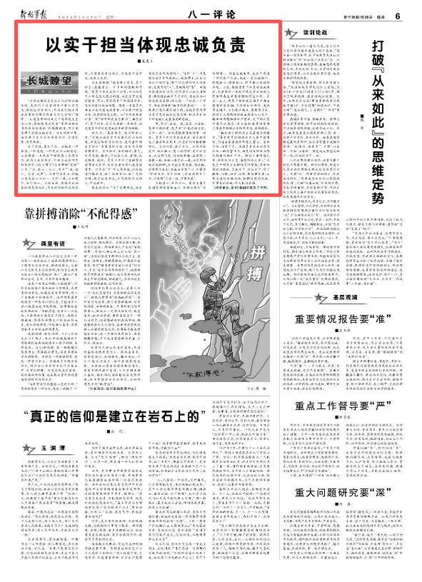 习主席强调:“能否敢于负责、勇于担当,最能看出一个干部的党性和作风。”党员干部是否实干担当,不仅仅是个人的态度或能力问题,而且是事关党的性质、事业,事关党员干部党性修养、作风形象的政治问题。衡量一名党员干部是不是对党忠诚负责,不仅要听他怎么说,更要看他怎么做。从“干部就要有担当”,到“好干部要勇于担当”,勤于实干、勇于担当,是习主席的一贯要求,也是党员干部对党忠诚负责的有力诠释。