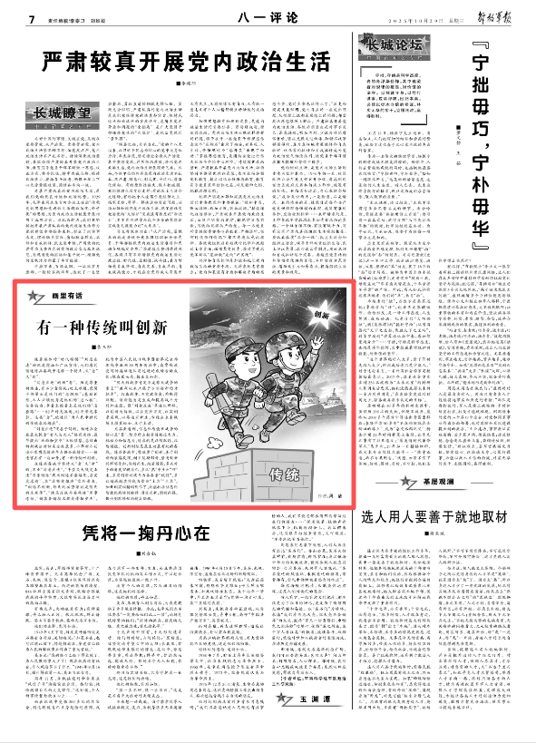 “明天的战争肯定不是昨天战争的重复”“胜利从来只属于不断创新的开拓者”。打赢战争,不突破老套,难取得辉煌。创新能力是生成和提高战斗力的加速器。像“刘老庄连”等连队那样,以创新为传统,以求变应万变,以实训求实战,以再造求新生,方能在未来战场上措置裕如、立于主动。