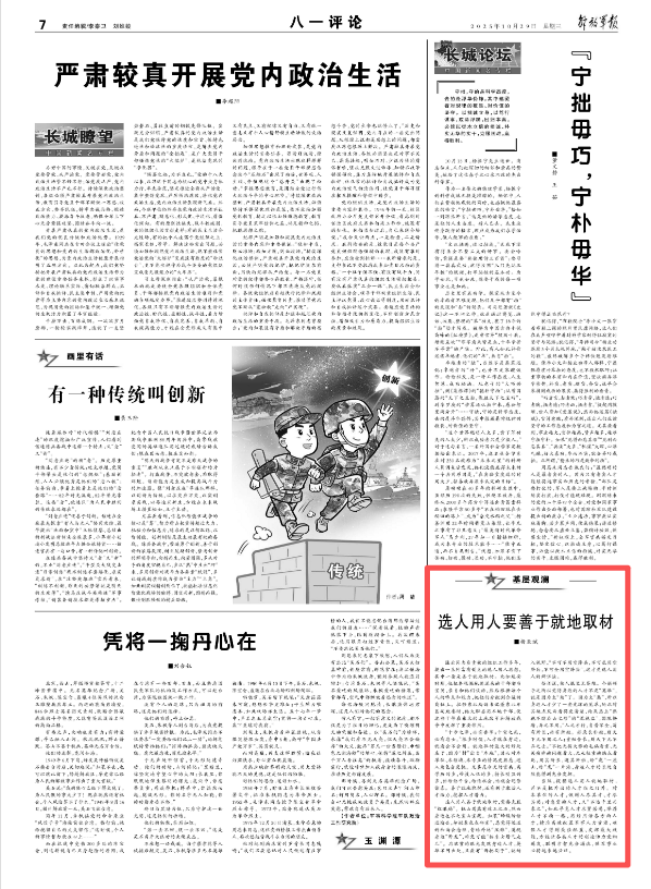 “十步之泽,必有香草;十室之邑,必有忠士。”很多时候,人才就在身边,就看会不会用。就地取材最大的好处在于,因为“材”出自“本地”,因而对本单位、本领域、本专业的情况更熟悉,进入角色会更快。尤其是今天的官兵,高学历的多,带技入伍的多,特长明显的多,你给他平台,给他机会,他就会还你惊喜。善于就地取材,还有利于激活人才活力,挖掘人才潜力。