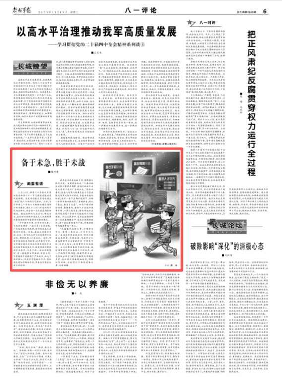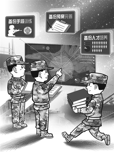“凡属艰难危险之事,必预筹而布之,务有一定之法,并计不定之法。”我们应坚持底线思维,研究和摸透战场环境、武器装备、作战样式和敌我强弱等方方面面因素,下好先手棋、打好主动仗,做好有针对性的备份。应扎实做好备份手段的训练、备份预案的完善和备份人才的培养,进一步细化作战构想、创新作战方法、完善战法体系,把可能出现的问题想在前,把必要的准备做细做实,确保任何时候、任何情况下都能有备无患、克敌制胜。
