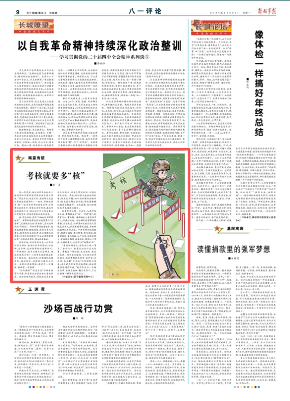 教育界有这样一句名言:从某种意义上说,考核就是考“核”。所谓“核”,就是重点人、重点题。强调的是力量用在刀刃上,不撒胡椒面。具体到年终军事训练考核,首长机关、指挥员和关键岗位人员就是重点人,新域新质作战训练、平时短板弱项就是重点题。年终军事训练考核时,核减好内容,瞄准弱项、聚焦短板;核查好标准,着眼实战、从严从难;核实好战力,校准强项弱项,摸清底数,做到心中有数,这样的考核,必然因“核”而带动“合”。