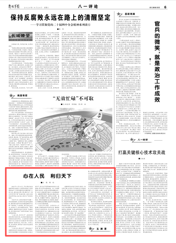 “心在人民,利归天下”,是我们党的性质宗旨决定的,也是我们党的政治优势和先进性所在。从毛泽东同志提出的“全心全意为人民服务”到习主席秉持的“我将无我,不负人民”,百年大党,历经风雨,始终把人民的利益高高地举过头顶。