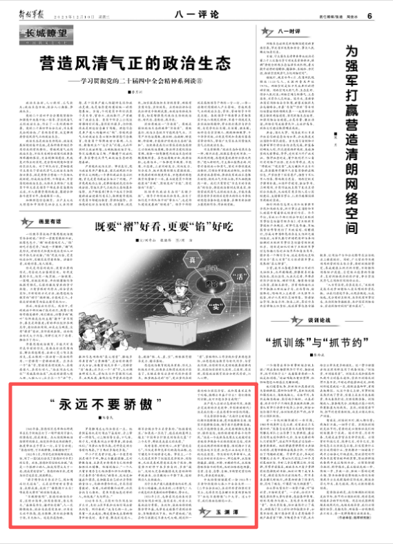 习主席谆谆告诫:“无论什么时候我们都不能骄傲自满,党不能骄傲自满,国家不能骄傲自满,领导层不能骄傲自满,人民不能骄傲自满,而是要增强忧患意识、慎终追远,始终保持艰苦奋斗的作风。”这是一个成熟马克思主义政党对自身艰苦卓绝奋斗历程的深刻总结、对历史治乱规律的深刻借鉴,深刻揭示了我们党永远不变质、红色江山永远不变色的内在原因。作为新时代革命军人,我们应当时刻不忘初心、牢记使命,永远保持谦虚、谨慎、不骄、不躁的作风,永远保持艰苦奋斗的作风,及时扫除思想阴霾,自重、自省、自警、自励,不断坚定前行的步伐,考出更好成绩。