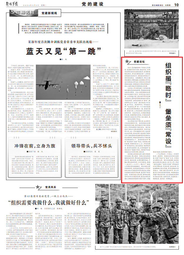 近日,笔者翻阅部队下阶段工作筹划,发现执行演习演训、联合作业、专项活动等阶段性任务越来越多,时间跨度越来越长,涉及范围越来越广,这给临时党组织设置运行、制度落实等提出了新的更高要求。这提醒我们,部队打破传统建制以模块编组、机动编队等形式遂行任务成为常态后,要更加注重临时党组织建设,确保组织力量延伸到每个战位,组织功能作用得到充分发挥。