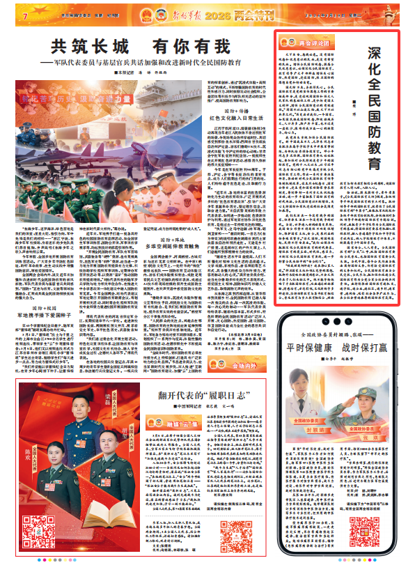 国家安全,人人有责。全民国防教育的“全民”二字,既指国防教育要向全民普及,也指国防教育需要全民来抓。当代中国,每个公民都应当依法履行国防义务,都有接受国防教育的义务和权利。全民国防教育应当全民受教、全民参与,把加强和改进全民国防教育作为全党全军全社会的共同责任。应持续推动国防教育进机关、进学校、进企业、进社区、进乡村、进军营、进网络,吸引社会各界广泛参与,在全社会营造浓厚的国防教育氛围。
