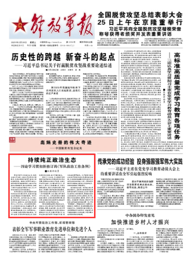 营造风清气正的政治生态,既是全面从严治党、全面从严治军的必然要求,也是加强和改进军队政治工作的重要任务。新修订的《军队政治工作条例》对坚持党要管党、全面从严治党作出明确规范,提出具体要求,体现了新时代我党我军锲而不舍、久久为功纯正政治生态的坚定意志。