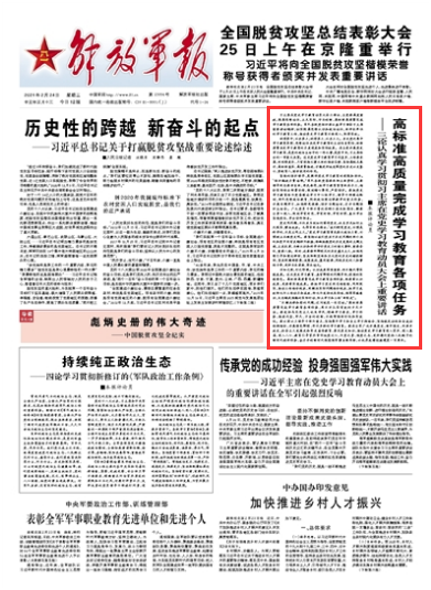 习主席在党史学习教育动员大会上指出,全党要高度重视,提高思想站位,立足实际、守正创新,高标准高质量完成学习教育各项任务。军队各级党组织要认真学习领会习主席重要讲话精神,切实提高思想认识和政治站位,抓好本单位的学习教育工作,推动党史学习教育不断深入、取得实效。