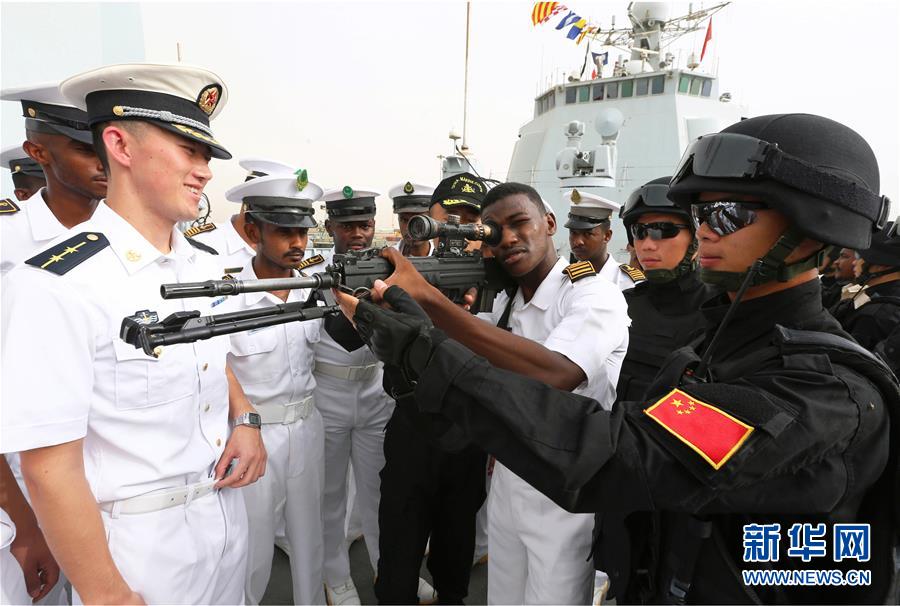 2015年8月27日,中国海军152舰编队访问苏丹红海州期间,苏海军学院学员参观济南舰时,亲身体验特战队员的武器装备。新华社发(代宗锋 摄)
