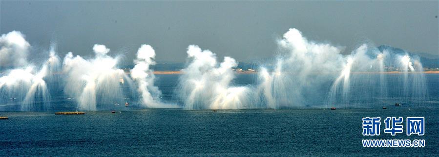 2016年9月18日,中俄“海上联合-2016”演习举行立体夺控岛礁演练。这是掩护陆战队员冲滩的烟幕弹在空中炸开(资料照片)。新华社发(孙宏韬 摄)