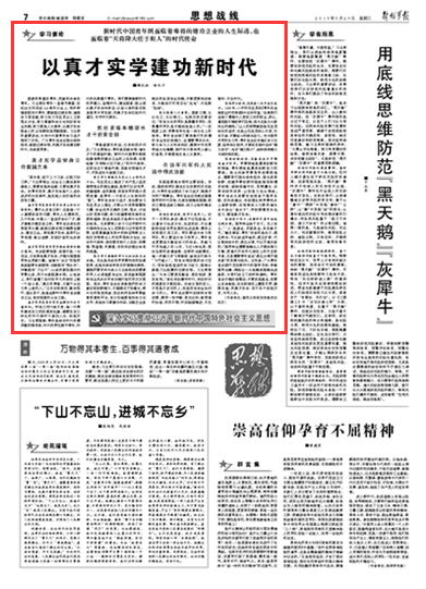 “凿井者,起于三寸之坎,以就万仞之深。”习主席指出,社会主义建设者和接班人,既要有高尚品德,又要有真才实学。对青年而言,真才实学是个人成长进步的内在条件,是实现人生价值的决定性力量。请关注今日《解放军报》的报道——
