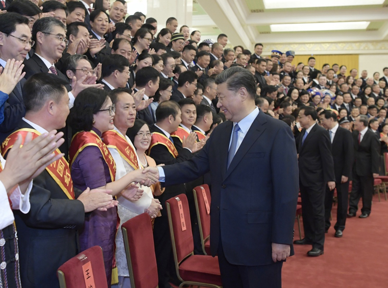 上午10时,习近平等来到人民大会堂北大厅,全场响起热烈掌声。习近平等同代表们亲切握手,不时交谈,并同大家合影留念。