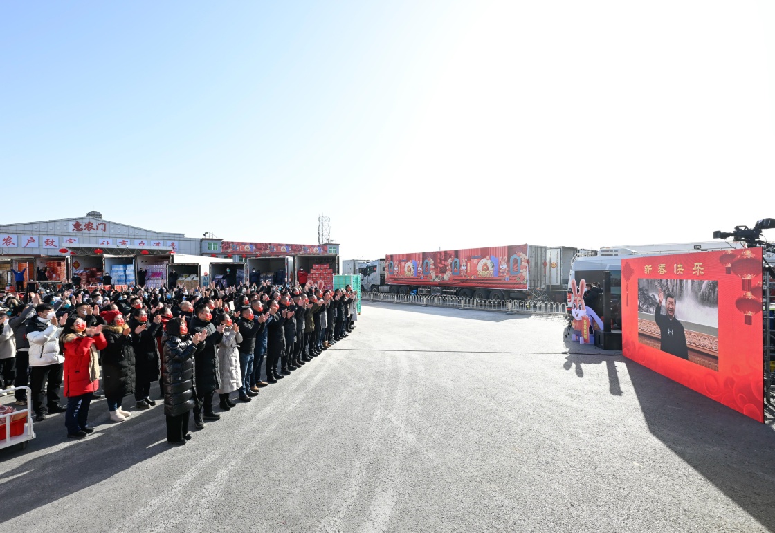 1月18日,中共中央总书记、国家主席、中央军委主席习近平在北京通过视频连线看望慰问基层干部群众,向全国各族人民致以新春的美好祝福。这是习近平通过视频连线,同北京新发地农产品批发市场的商户和采购年货的群众亲切交流。新华社记者 申宏 摄