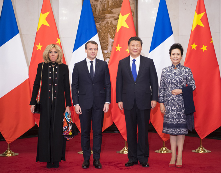 习近平主席夫人彭丽媛,中共中央政治局委员、国务委员杨洁篪和马克龙总统夫人布丽吉特等参加会见。