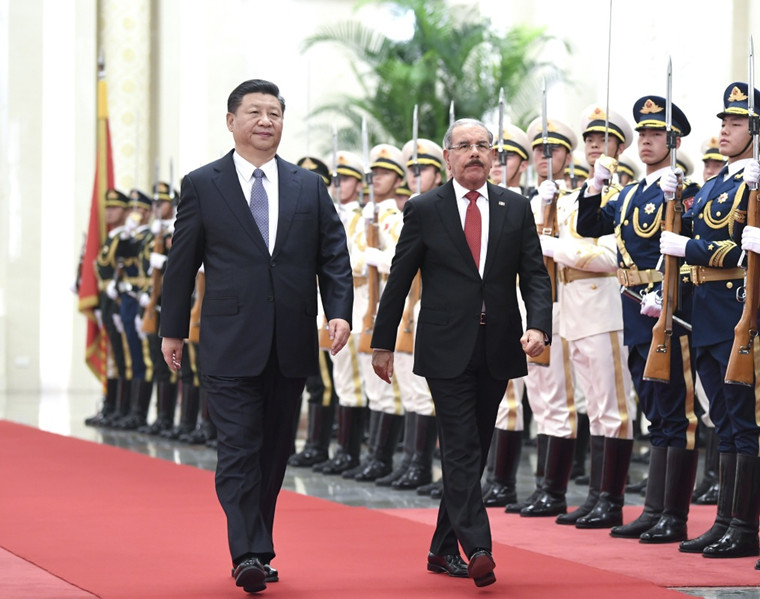 11月2日,国家主席习近平在北京人民大会堂同多米尼加总统梅迪纳举行会谈。这是会谈前,习近平在人民大会堂北大厅为梅迪纳举行欢迎仪式。新华社记者 燕雁 摄