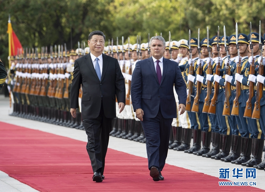 7月31日,国家主席习近平在北京人民大会堂同哥伦比亚总统杜克举行会谈。这是会谈前,习近平在人民大会堂东门外广场为杜克举行欢迎仪式。 新华社记者李涛 摄