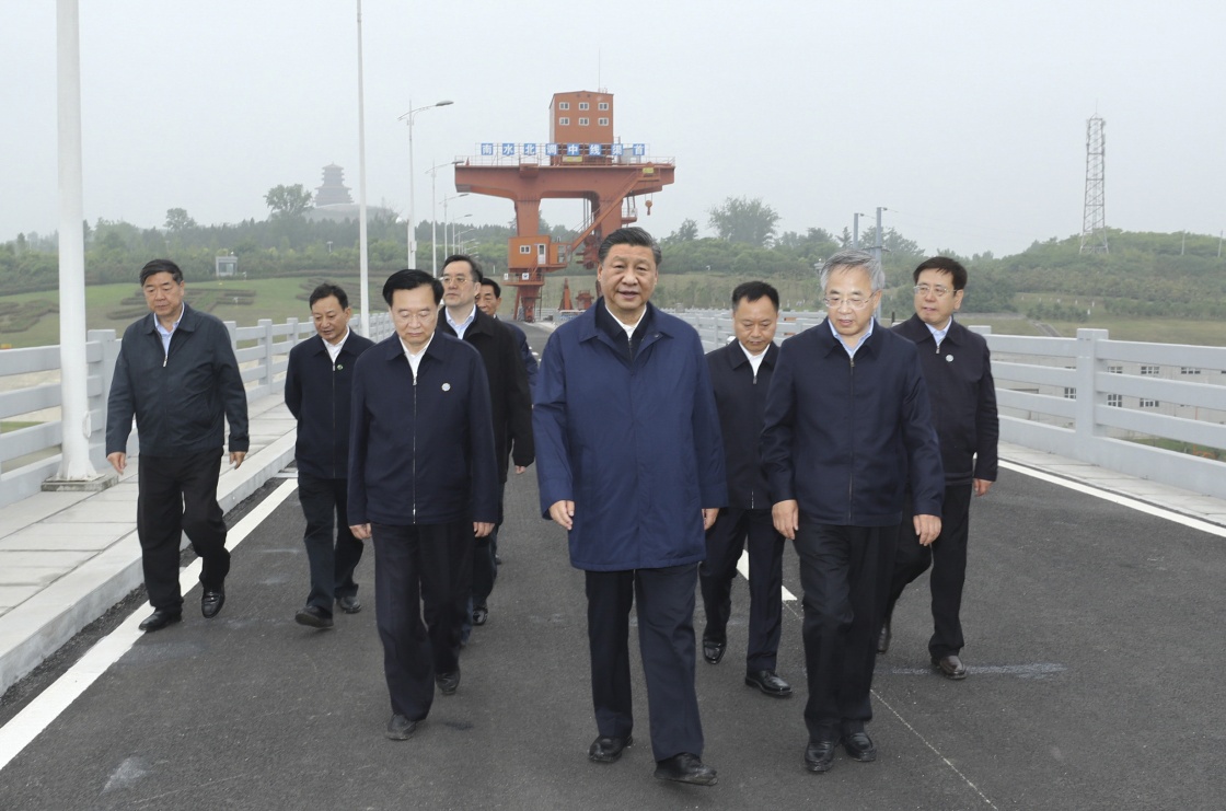 5月14日上午,中共中央总书记、国家主席、中央军委主席习近平在河南省南阳市主持召开推进南水北调后续工程高质量发展座谈会并发表重要讲话。这是座谈会前,习近平于13日在南阳市淅川县陶岔渠首枢纽工程考察。新华社记者 鞠鹏 摄