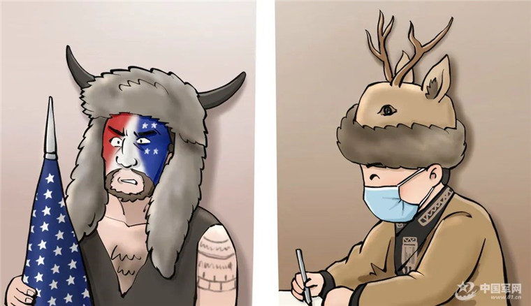 图左:美国国会骚乱中,头戴牛角帽,脸涂红白蓝三色颜料,赤裸上身的“牛头萨满”。