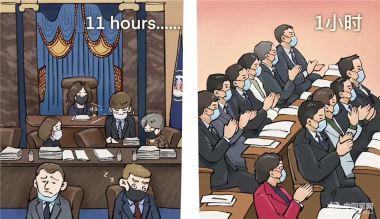图左:美国两党为1.9万亿美元新冠疫情纾困方案反复拉锯,共和党参议员采取阻挠议事“战术”,提出“现场全文朗读628页议案”的要求,花费11个小时阅读全文。