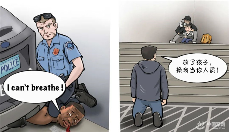 图右:昆明某中学校门外,一名学生被劫持。民警跪地喊话愿替换孩子,自己做人质。