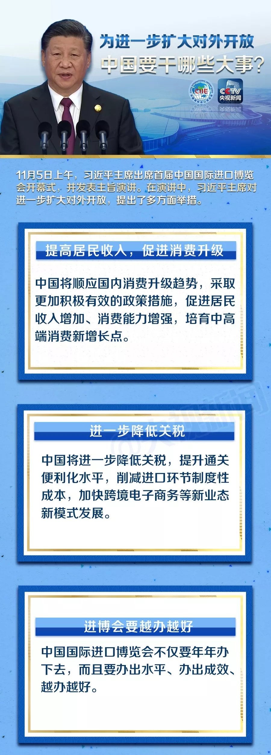 11月5日,首届中国国际进口博览会在上海开幕,中国国家主席习近平出席开幕式并发表主旨演讲。