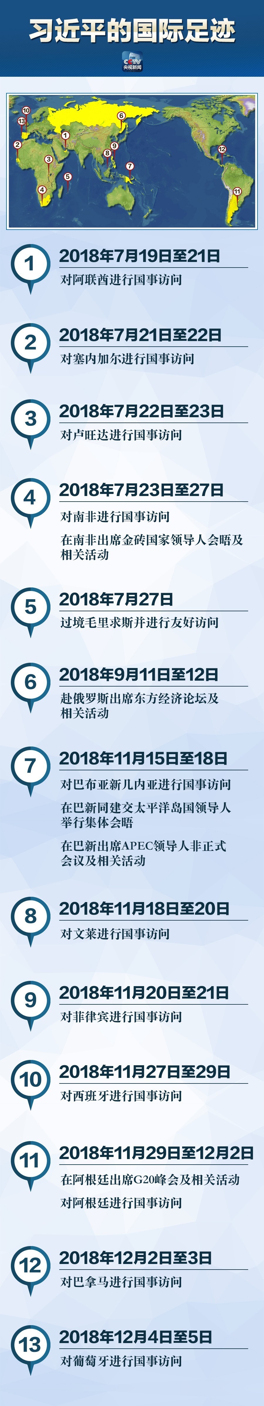 2018年接近尾声,在这一年中,习近平主席四次踏出国门,足迹遍布亚非欧拉美以及大洋洲13国,参加了金砖国家领导人会晤、APEC领导人非正式会议以及G20峰会等多场国际会议。