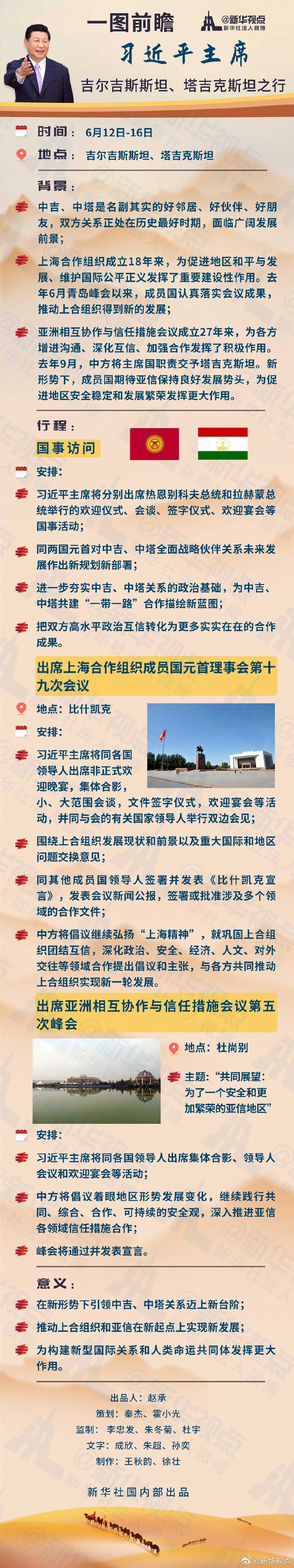 习近平主席将于6月12日至16日对吉尔吉斯斯坦、塔吉克斯坦进行国事访问并出席在比什凯克举行的上海合作组织成员国元首理事会第十九次会议和在杜尚别举行的亚洲相互协作与信任措施会议第五次峰会。这次出访有啥看点?戳图秒懂!