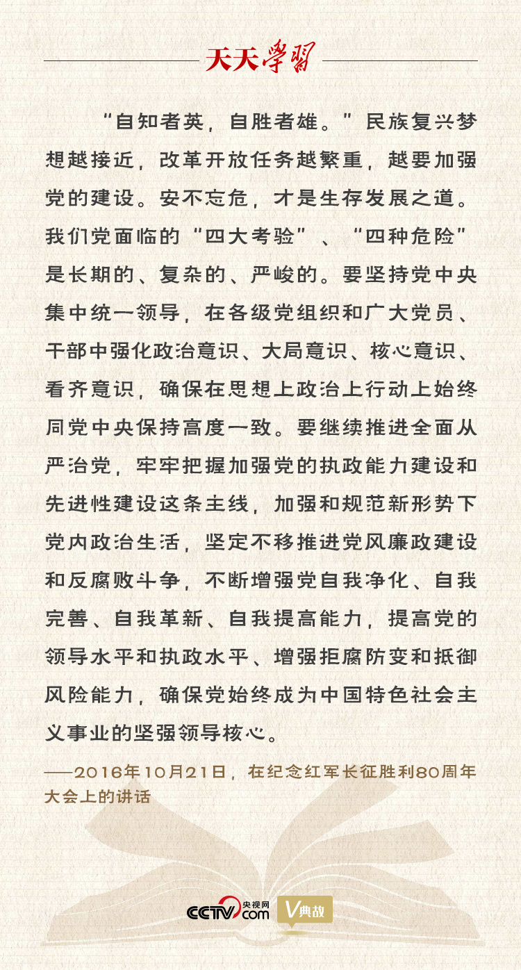 关于英雄,一个时代有一个时代之定义,一个时代有一个时代之英雄。但“自知”与“自胜”无疑是历代英雄的共同品质。对于中国共产党人而言,就是不断增强党自我净化、自我完善、自我革新、自我提高能力,提高党的领导水平和执政水平,增强拒腐防变和抵御风险能力,以确保党始终成为中国特色社会主义事业的坚强领导核心。