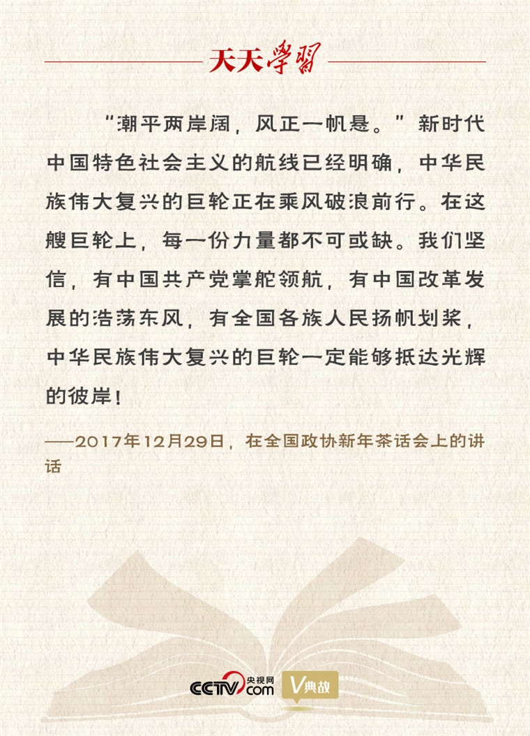 新征程上,我们要乘着新时代的浩荡东风,加满油,把稳舵,鼓足劲,让承载着14亿多中国人民伟大梦想的中华巨轮继续劈波斩浪、扬帆远航,胜利驶向充满希望的明天!