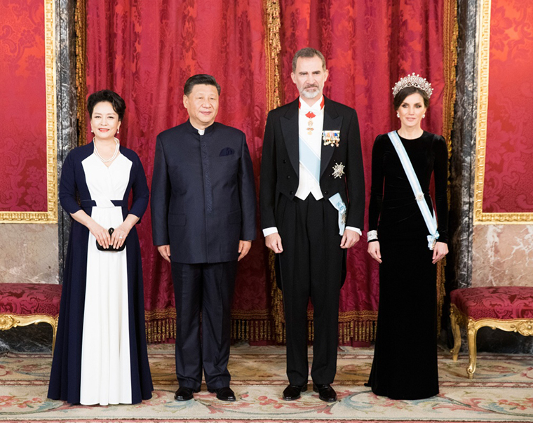 晚8时许,习近平和夫人彭丽媛抵达马德里王宫,费利佩六世国王和莱蒂西娅王后热情迎接。两国元首夫妇握手合影,随后同出席欢迎宴会的中西两国来宾一一握手,互致问候。