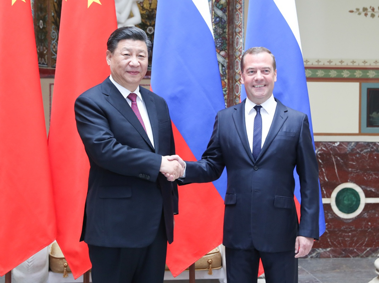 6月6日,国家主席习近平在莫斯科会见俄罗斯总理梅德韦杰夫。新华社记者 姚大伟 摄